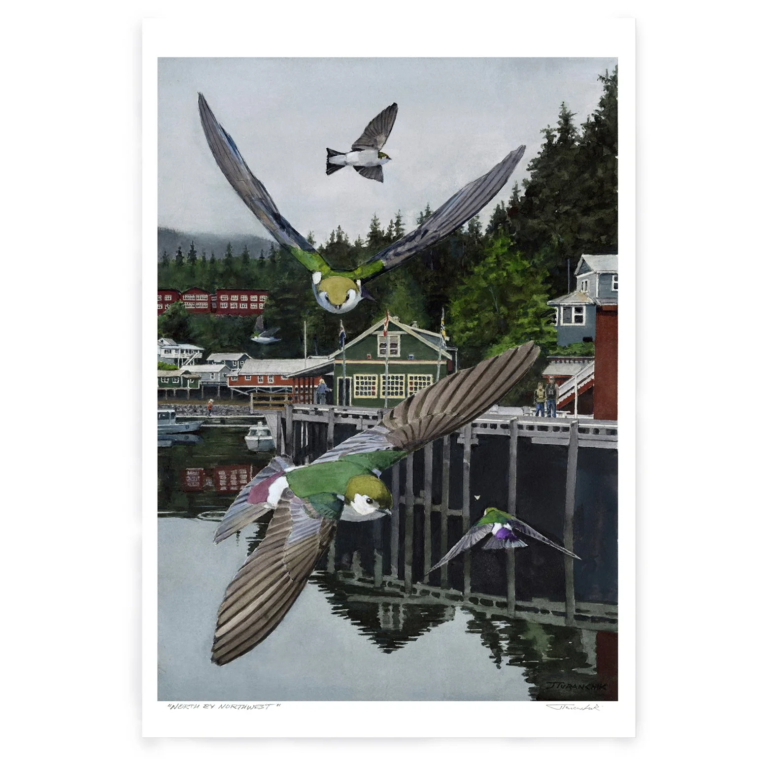 “It’s hard to find a bird more charming than the Violet-Green Swallow, and you couldn’t find a more delightful place to see them in action than Telegraph Cove on the northeastern coast of Vancouver Island, British Columbia. Walking along the boardwalk loop that looks back at the cove, I watched gleefully as these elfin masters of the air, bedecked in feather patterns more fitting to the sub-tropics than to the Pacific Northwest, snatched insect prey out of the sky. Previously I had only encountered them in Southern California along a reclaimed stretch of the Los Angeles River adjacent to the Sepulveda Nature Preserve. It’s a small oasis of nature amidst a massive sprawl of urban development. Here was the opposite scenario. A small outpost of humanity amidst the massive sprawl of nature. The seed for a painting had been planted.” J.T.